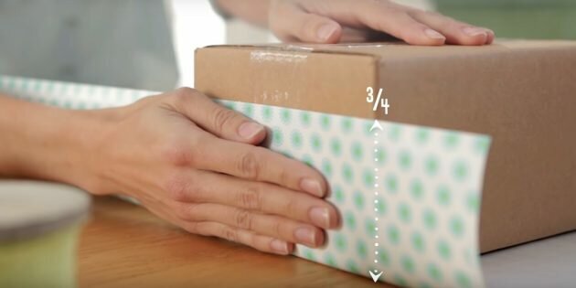 Разложите бумагу и поставьте на неё подарок. С узкой стороны отмерьте столько бумаги, чтобы она прикрывала параллелепипед на три четверти.