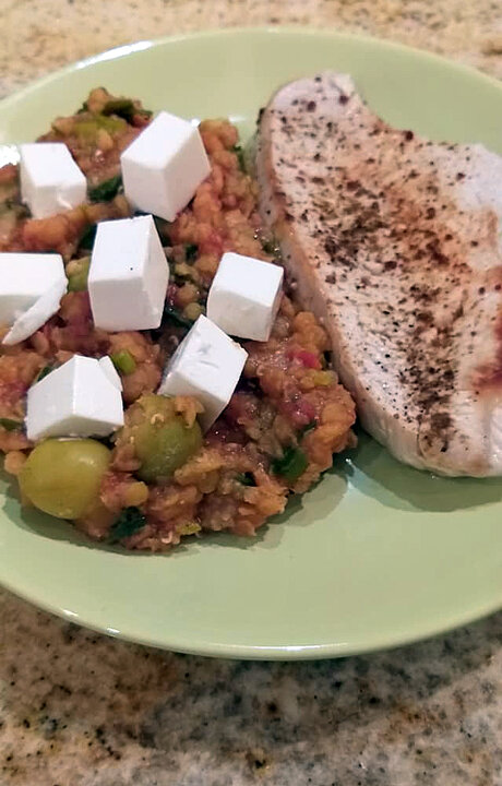 Предлагаю блюдо из красной чечевицы. Идею почерпнула в группе, а аранжировка моя. Чечевицу отварила до полуготовности, но вода выпарилась. Добавила массу из перетёртых помидоров. Проварила. Туда же соль, специи (хмели-сунели), 1/2 чайной ложки грузинской аджики, перец, чеснок, зеленый лук, кинзу, а в самом конце оливки с лимоном. Общее время готовки - не более 15 минут. При подаче на чечевицу выложила кубики мягкой сербской брынзы. Мне это показалось очень вкусным и интересным сочетанием! И добавила кусок запечённой грудки индейки. Приятного аппетита! + 2 фото Больше общения и рецептов - в группе "Жизнь с диабетом" в Facebook! Рецепт на странице в Facebook Автор рецепта - Светлана Поливина