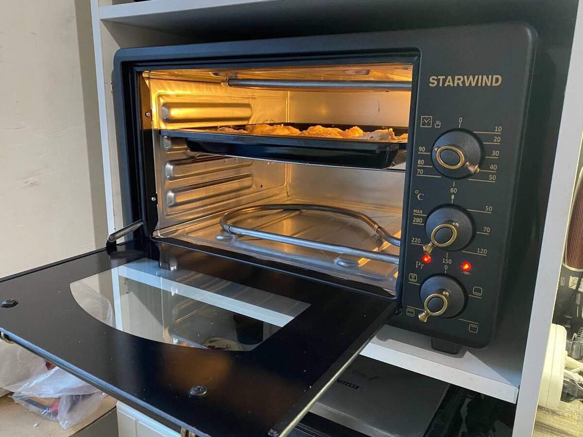 Более того, теперь стала готовить с еще большим удовольствием, так как это стало намного удобнее. Я раньше даже не задумывалась, что пользоваться обычной духовкой, которая есть практически в каждой плите, настолько не удобно. Особенно, это понимаешь с возрастом. Постоянно наклоняться, туда-сюда поднимать тяжелый противень - достаточно тяжело. Потому я всегда мечтала о встроенном духовом шкафе. Но, присматривая кухонную технику, я понимала, что купить ее в ближайшем будущем (лет 10 точно) не смогу. Но случайно мне на глаза попалась мини-печь Starwind SMO 2027. Во-первых, понравился его дизайн, во-вторых, его размеры просто идеально вписываются в нашу кухню. А, в-третьих, стоимость этой мини-печи вполне демократическая. По крайней мере, позволить себе приобрести данную технику может любая российская семья. Посоветовавшись с супругом, я заказала себе эту печь. Кстати, мою покупку доставили мне уже через день несмотря на то, что мы живем достаточно далеко от Москвы. Куриные крылышки -