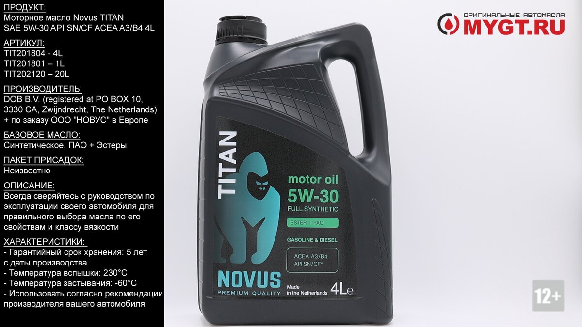 Продукт: Моторное масло Novus TITAN SAE 5W-30 API SN/CF ACEA A3/B4 4L Наш телефон: 8-800-550-57-22 ПН-ПТ 9.00-17.00 (МСК+4) Артикул: TIT201804 - 4L TIT201801 – 1L TIT202120 – 20L Производитель: DOB B.V. (registered at PO BOX 10, 3330 CA, Zwijndrecht, The Netherlands) + по заказу ООО "НОВУС" в Европе. Базовое масло: Синтетическое, ПАО + Эстеры. Пакет присадок: Неизвестно Ссылка для покупки: https://mygt.ru/oil/ Премиальное полностью синтетическое моторное масло (технология «Ester+PAO») для легковых автомобилей, разработанное с применением современных технологий. Отвечает жестким европейским и российским требованиям к характеристикам моторных масел для легковых автомобилей, внедорожников, фургонов и малотоннажных грузовиков, оснащенных бензиновыми или дизельными двигателями. Может использоваться в двигателях с турбонаддувом и без. Обеспечивает стабильную масляную пленку при холодном запуске и сохраняет ее при высоких температурах, сводит трение к минимуму. Способств