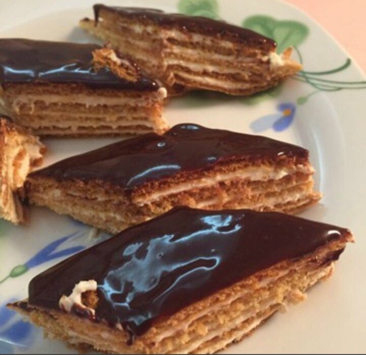 Торт Птичье Молоко Ингредиенты Для теста Сахар 1 стак. Молоко 4 ст. л. Мед 3 ст. л. Яйцо 2 шт Сода 1,5 ч. л. Уксус 1,5 ст. л. Мука пшеничная 3 стак. Масло сливочное 100 г Для крема Мука пшеничная 4 ст. л. Масло сливочное 250 г Сахар 1 стак. Молоко 650 мл Для глазури Масло сливочное 70г Молоко 6 ст. л. Сахар 5 ст. л. Какао-порошок 3 ст. л. Количество порций: 10 порции Время приготовления: 90 минут Способ приготовления 1. Выложить в кастрюлю с толстым дном масло, сахар, молоко и мёд. Поставить на средний огонь, периодически помешивая. 2. Яйца взбить вилкой, не надо взбивать до пены. Когда масло растает и масса станет однородной, не переставая мешать тонкой струйкой влить взбитые яйца. Перемешать. Добавить погашённую уксусом соду. Перемешать. 3. Когда масса запенится и увеличится в объёме, кастрюлю с плиты убрать. 4. Всыпать по одному стакану просеянную муку. Хорошо перемешать. Тесто получается густым и липким. 5. Стол обильно посыпать мукой. Выложить на стол тесто. Тесто месить не