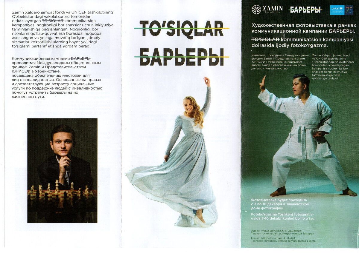В Международный день инвалидов, 3 декабря в Доме фото столицы открылась фотовыставка «Барьеры», которая является частью Международного веб-форума ZAMIN «Обеспечение инклюзии для детей с инвалидностью». Экспозиция также приурочена к Всемирному дню ребенка и 75-летию ЮНИСЕФ и продлилась до 10 декабря.