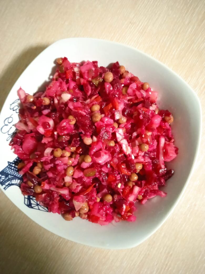 Продукты: Отварная свекла - 2 шт. Картофель отварной - 4-5 шт. Морковь отварная - 1 шт. Огурцы соленые - 3 шт. Горошек зеленый - 1 банка Квашеная капуста - 200 гр. Репчатый лук - 1 шт. Подсолнечное масло для заправки - по вкусу. Приготовление: Отвариваем картофель, свеклу и морковь. Охлаждаем. Очищаем от кожицы и нарезаем кубиками отварные овощи, соленые огурцы и лук. Высыпаем в чашу. Добавляем горошек и квашеную капусту. Солим по вкусу. Заправляем подсолнечным маслом. Наш салат готов! Приятного аппетита! #винегрет #как приготовить винегрет #рецепт винегрета