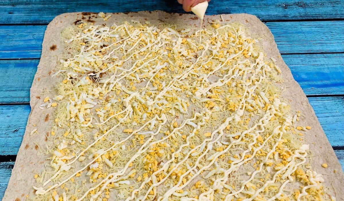1. Берём лист лаваша, выкладываем тёртый сыр, яйца и сверху наносим тонкий слой майонеза. Для идеальной тонкой сетки я использую обычный целлофановый пакет. 2. Сверху равномерно распределяем мелко нарубленную копчёную курицу. Для рецептов, где нужна копчёная курочка, я всегда беру бёдрышки, это, на мой взгляд, самая вкусная часть. 3. Дополняем начинку 4-5 столовыми ложками консервированной кукурузы. 4. Самое вкусное - консервированные ананасы! Режем мелким кубиком, выкладываем на лаваш и добавляем немного майонеза.