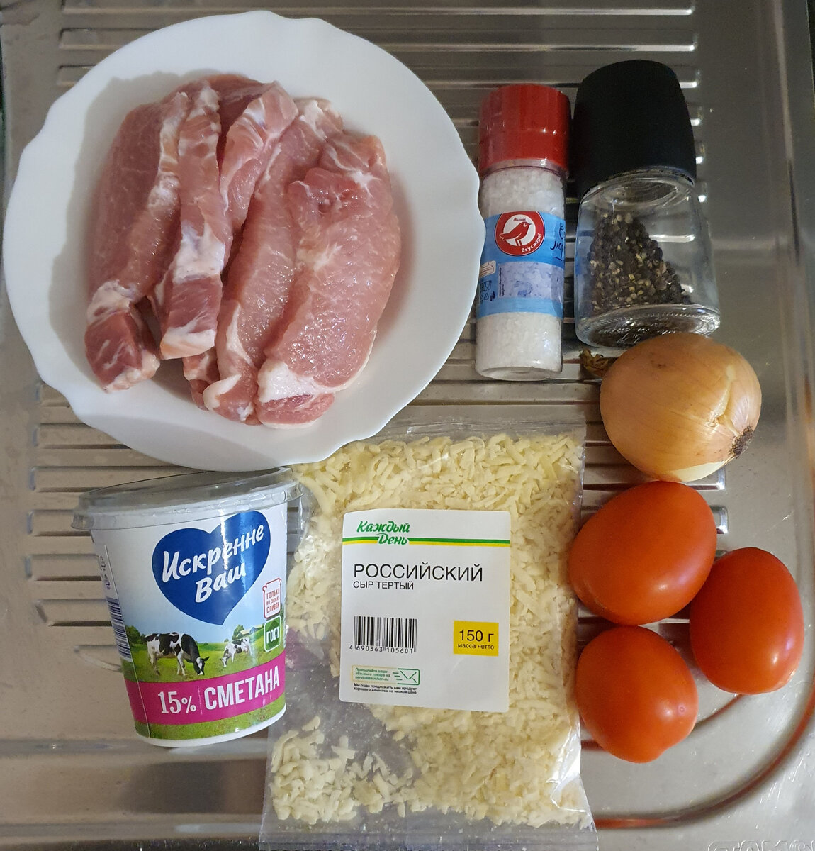 Прекрасный способ красиво подать отбивные. Свинина получается мягкой и сочной. В итоге получается шикарное, но очень простое в приготовлении блюдо, которое подойдет как для сытного обеда или ужина, так и для праздничного стола. В преддверии Нового года это просто находка! Ингредиенты: - свинина (карбонад или вырезка) 500 грамм - помидоры 2 штуки - лук репчатый 1 штука - сыр твёрдый 200 грамм - сметана 100 грамм - соль и чёрный молотый перец по вкусу - растительное масло 1 столовая ложка Свинину нарезать порционными кусками примерно по 5-7 мм толщиной, накрыть пищевой пленкой и отбить кухонным молотком. Лук очистить и нарезать кубиком. Помидоры нарезать кружками толщиной 3-4 мм. Сыр натереть на крупной терке. Я взяла сразу натертый, это еще больше ускорило весь процесс. Выложить свиные отбивные на противень смазанный растительным маслом. Мясо посолить и поперчить с двух сторон. Смазать свинину сметаной. Выложить на свинину лук и равномерно его распределить. Сверху выложить по