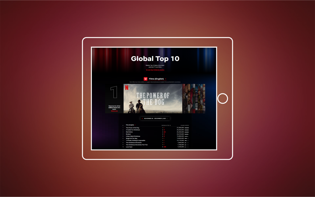 В середине ноября Netflix запустил новый веб-сайт, на котором каждую неделю будет делиться показателями с помощью нового способа ранжирования фильмов. Компания заявила, что она откажется от своей оценки популярности фильмов с помощью показателя кассовых сборов и будет ранжировать фильмы по общему количеству просмотренных часов. Метрика собирается с понедельника по воскресенье, и новый еженедельный Топ-10 будет обновляться каждый вторник со списками лучших фильмов и сериалов в следующих категориях: В каждом списке будет отображаться количество часов, проведенных за просмотром каждой телепередачи или фильма. По словам компании, в списках будут учитываться сезоны сериалов как отдельные позиции, но повторные просмотры в рамках сезона будут засчитываться в общее количество часов просмотра этого сезона. Например, если пользователю понравился определенный эпизод из фильма и на протяжении недели он пересматривал его по несколько раз в день, то это время тоже будет учтено в глобальном рейтинге.