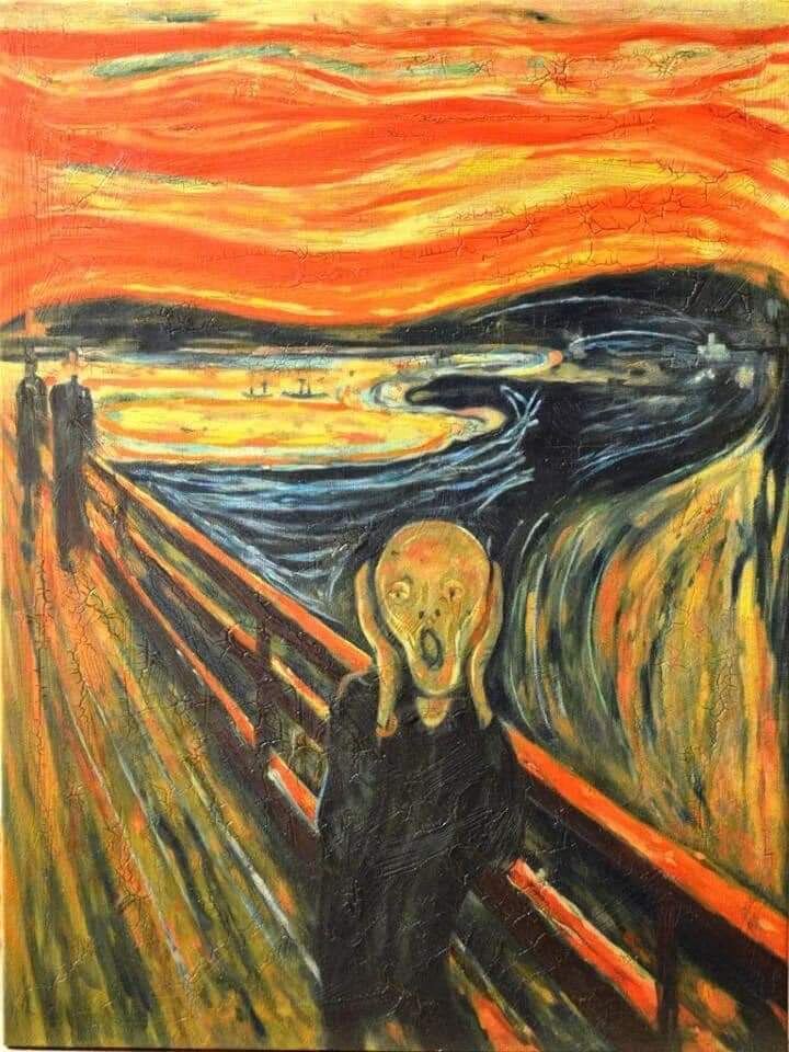 Какой смысл вложил он в свою неоднозначную работу? Что хотел сказать миру? Картина "Крик", как и многочисленные ее варианты, до сих пор является одним из самых загадочных шедевров мировой живописи. Многие критики полагают, что сюжет картины - плод больной фантазии психически нездорового человека. Кто-то видит в работе предчувствие экологической катастрофы, кто-то решает вопрос о том, какая именно мумия вдохновила автора на эту работу. Помещенная в центр композиции фигура отчаянно кричащего человека, притягивает внимание в первую очередь. На обезличенном до примитива лице читается отчаяние и ужас, граничащие с безумием. Автору удалось передать мощнейшие человеческие эмоции. В глазах страдание, широко открытый рот делает сам крик пронзительным и реально ощутимым. Поднятые руки, закрывающие уши, говорят о рефлекторном желании человека убежать от себя самого, прекратить этот приступ страха и безнадежности. Красное, огненно горячее небо накрыло холодный фьорд, который, в свою очередь