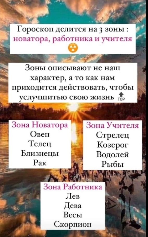 У каждого человека есть натальная карта. И в каждой карте есть 3 ЗОНЫ, которые рассказывают о наших способностях, условиях проживания и как нужно действовать, чтоб добиться успеха ⭐ ✴ Зона НОВАТОРА ⠀ Если в карте заполнены первые 4 знака зодиака* (самые молодые и юные, не нюхавшие пороха😜): Овен, Телец, Близнецы и Рак - то Вы новатор (или ученик/творец). *Также если много планет в домах с 1 по 4. Новаторы часто полны энтузиазма, они любознательны, просты, хитры, наивны. Хотят открыть мир с новых сторон, внести в него что-то новенькое😀. В голове полно оригинальных идей, увы, довести дело до конца - главная проблема новаторов... им важно не бросать дело на полпути. ✴ Зона РАБОТНИКА Когда в карте заполнены Лев, Дева, Весы, Скорпион * - значит, Вы работник. *Также если много планет в домах с 5 по 8. Работники - настоящие перфекционисты и трудоголики. Вот они всегда доводят дело до конца. Все вокруг замечают, анализируют, ко всему придираются🧐 - отличные критики. Им легче не придумыва