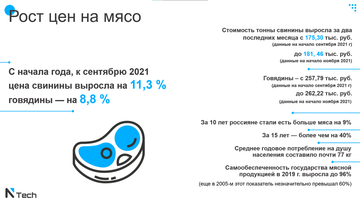 Можно выделить три ключевых фактора, которые влияют на стоимость мяса на рынке: основным является резкий рост цен на зерно, которое используется для корма скота, а также ряд эпидемий, которые привели к снижению поголовья и подорожанию импорта в связи с его ограничением.