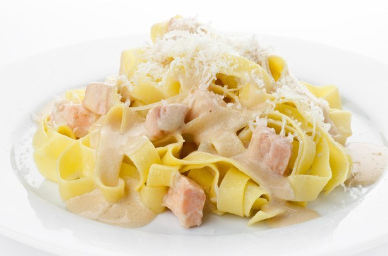 Вливаем сливки, смешиваем, добавляем приправы и пармезан.