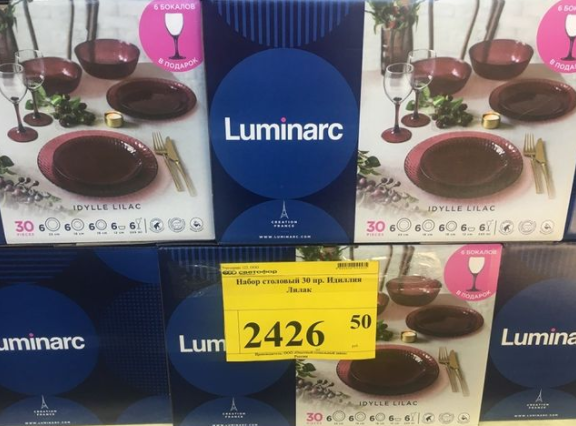 Практически все товары в "Светофоре" заполнили полки яркими упаковками и этикетками. Но я всегда с опаской посматриваю на такие товары, хотя в последнее время появляется много исключений, а о посуде я вообще молчу, она вся неплохая и дешёвая. В этом обзоре хочу поделиться с вами увиденными новинками, которые я заметила в "Светофоре" города Крымск. Столовый стеклянный набор Luminarc из 30 предметов, в том числе подарочные 6 бокалов для вина. Цена 2426 рублей. Стеклянная форма для запекания от фирмы Luminarc на 3 литра. Цена 440 рублей. Столовый набор из опалового стекла Luminarc, в комплекте 6 десертных тарелок на 19 см, 6 тарелок на 23 см и 6 кружек на 250 мл. Цена 1272 рубля. Плетённая корзина для белья на 50 литров. Цена 480 рублей. Беспроводный микрофон для караоке с современными функциями, изменение голоса и эхо. Цена 350 рублей. Детский шампунь-гель 3 в 1 Mega vonsters на 650 мл. Цена 110 рублей. В бутылке на 3 литра "Белизна". Цена 36 рублей. Беспроводные наушники с радио, местом