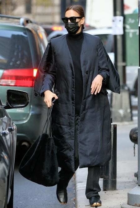 В этом сезоне стритстайл российской супермодели — настоящее признание в любви к total-black. Уже не помним, когда в последний раз видели звезду в аутфитах в ярких тонах, но, стоит признать, темные оттенки ей определенно к лицу. Универсальный рецепт от Ирины — расслабленные брюки плюс водолазка, а основной акцент супермодель предлагает сделать на верхней одежде и обуви. Она выгуливает легкий длинный пуховик с оригинальной отделкой на спине и мягкую кожаную обувь на плоской подошве, предлагая альтернативу господствующему в эти месяцы тренду на грубую обувь. Лук завершают объемная сумка и черные солнцезащитные очки.