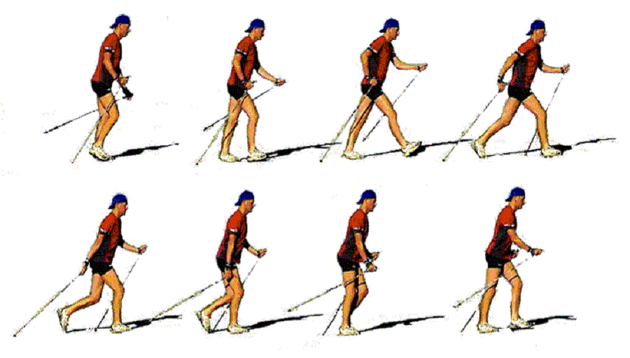 Принцип движения здесь похож на классический лыжный попеременный двухшажный ход, когда отталкивание левой рукой совпадает с шагом правой ноги и наоборот. Движения при ходьбе должны быть по возможности максимально ритмичными. Как сказано выше , корпус держится прямо, голова ровно – не запрокинута и не опущена, взгляд направлен вперёд. Махи руками широкоамплитудные, от плеча, обязательно задействуя широчайшие мышцы спины. В конечной фазе отталкивания локоть руки полностью выпрямляется, включая в работу трицепс, а ладонь не сжимает рукоять палки, а, наоборот, раскрывается, нагружая мышцы предплечья и кисти. При шаге следует активно отталкиваться стопой, упруго перекатываясь с пятки на носок.