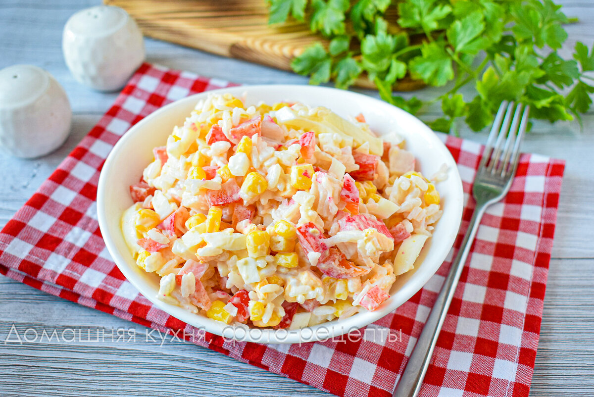 Салат с кукурузой, рисом и крабовыми палочками
