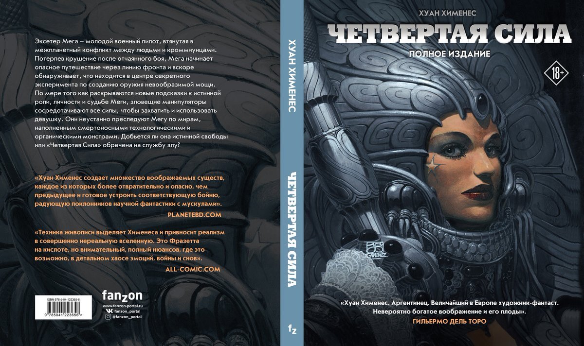 Графический роман. Автор его известен также работой «Метабароны», созданной в содружестве с Алехандро Ходоровским. «Четвёртая сила». Полное издание. Хуан Хименес: [перевод с английского С.Карпова]. - Москва: ЭКСМО (FanZon), 2021. - 256 с. Это полное издание включает книги 1-4 графического романа Хуана Хименеса. История Начало, как в заштатном боевике: в разных уголках воюющей с Землёй системы Кроммиуна, при разных обстоятельствах некими спецами похищаются женщины… В ходе специального задания, потеряв двух боевых подруг, выживает лишь одна - кроммиунский военный пилот Эксетер Мега… Пришедшая в себя после тайно проведённого над ней сумасшедшими учёными эксперимента Мега ощущает присутствие внутри ещё трёх женских разумов, подчиняет их и… становится сверхразумом со всеми вытекающими… Последующие две книги продолжающие враждовать стороны всеми способами пытаются завладеть сверхразумом. Последняя, четвёртая книга - самая крутая: сумасшедшие космодесантные военные операции, жестокие битвы
