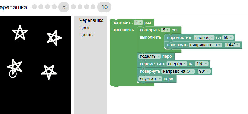 Раз уже мы теперь познакомились с понятием функции, хорошо было бы этот навык закрепить. В наших играх это не предусмотрено, поэтому возвращаемся в Черепашку на десятый уровень. Давайте возьмем до боли знакомую задачу из 5 уровня. Тут особенных проблем нет, кода не слишком много, но давайте все-таки её перепишем, используя функции. Напишем функцию "звезда", сделаем её гибкой, передавая я ей параметр длина. Да, кода не стало меньше, но он стал понятнее - это больше не нагромождение циклов - это ясная структура: вот мы рисуем звезду, а вот невидимую звезду со звездочками на конце. Но что еще более прекрасно, теперь, если захочется усложнить код, это сделать будет легче. Пусть задача будет звучать так - каждая следующая нарисованная звездочка должна быть больше предыдущей. Что делаем? Тут было бы хорошо завести переменную "длина_звезды", сначала она будет равна длине стороны самой маленькой звездочки, мы её будем передавать в функцию "звезда" и увеличивать. Пусть теперь задача звучит так