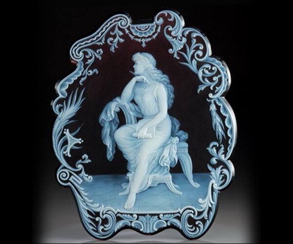 Панно «Происхождение живописи», диаметр 25,5 см, Джордж Вудал, Thomas Webb & Sons, 1884 г., Музей стекла Корнинг (Нью – Йорк).