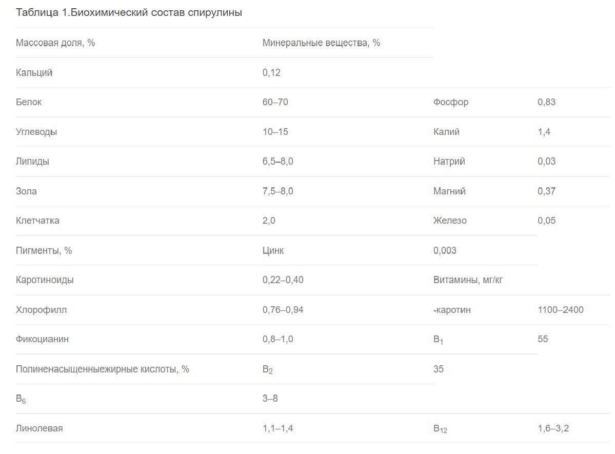 Спирулина-многоклеточная нитевидная сине-зеленая микроводоросль. Спирулинаплатенсис (Spirulinaplatensis) — это много клеточная спиральная нитчатая микроводоросль. По содержанию витаминов и микроэлементов спирулина, превосходитмногие продукты питания, как растительного, так и животного происхождения. Так, по содержанию витамина А спирулина превосходит сливочное масло и сыр в 400 раз, яйца в 1500 раз, творог и огурцы — в 2500 раз, молоко -в 10000 раз. Витаминов группы В (B1 В2, В3, В5, B6, B9, B12) содержится вспирулине в 40-150 раз больше, чем в молоке, сыре, твороге, мясе, рыбе,яйцах, сливочном масле. В спирулине содержатся также витамины Е (токоферол), С,минеральные вещества и микроэлементы: калий, кальций, магний, цинк, марганец, фосфор, железо, микродозы йода, селена, редких металлов, что очень важно для организма. Только в спирулине и некоторых других сине-зеленых и красных водорослях содержатся такие ценные для здоровья человека соединения, как фикоцианин, стимулирующий работу иммунной системы. Гамма-линоленовая кислота, содержится кроме спирулины только в материнском молоке. Хлорофилл включен в клетки спирулины в легко усваиваемой форме, онспособствует восстановлению клеток печени и обладает противоопухолевым действием. Спирулина содержит полный набор всех незаменимых аминокислот — изолейцин, лейцин, лизин, метионин, фенилаланин, треонин, триптофан, валин,аланин, аргинин, цистин, гистидин, тирозин, глютаминовая кислота, а такжеболее 2000 ферментов в микродозах, а также полный источник питательных веществ, около 65% белка, больше, чем любая другая пища, включая мясо и рыбу. Белки необходимы для поддержания ткани, поддержания роста и внесения гормонов в организме. Спирулина содержит восемь незаменимых и 10 других аминокислот и высокая концентрация витаминов и питательных веществ, чем любая другая естественная пища. Всего от 3 до 10 граммов спирулины в день дает впечатляющие суммы бета-каротин, витамины группыВ, витамин Е, незаменимые микроэлементы и гамма-линоленовой кислоты (GLA) [1].