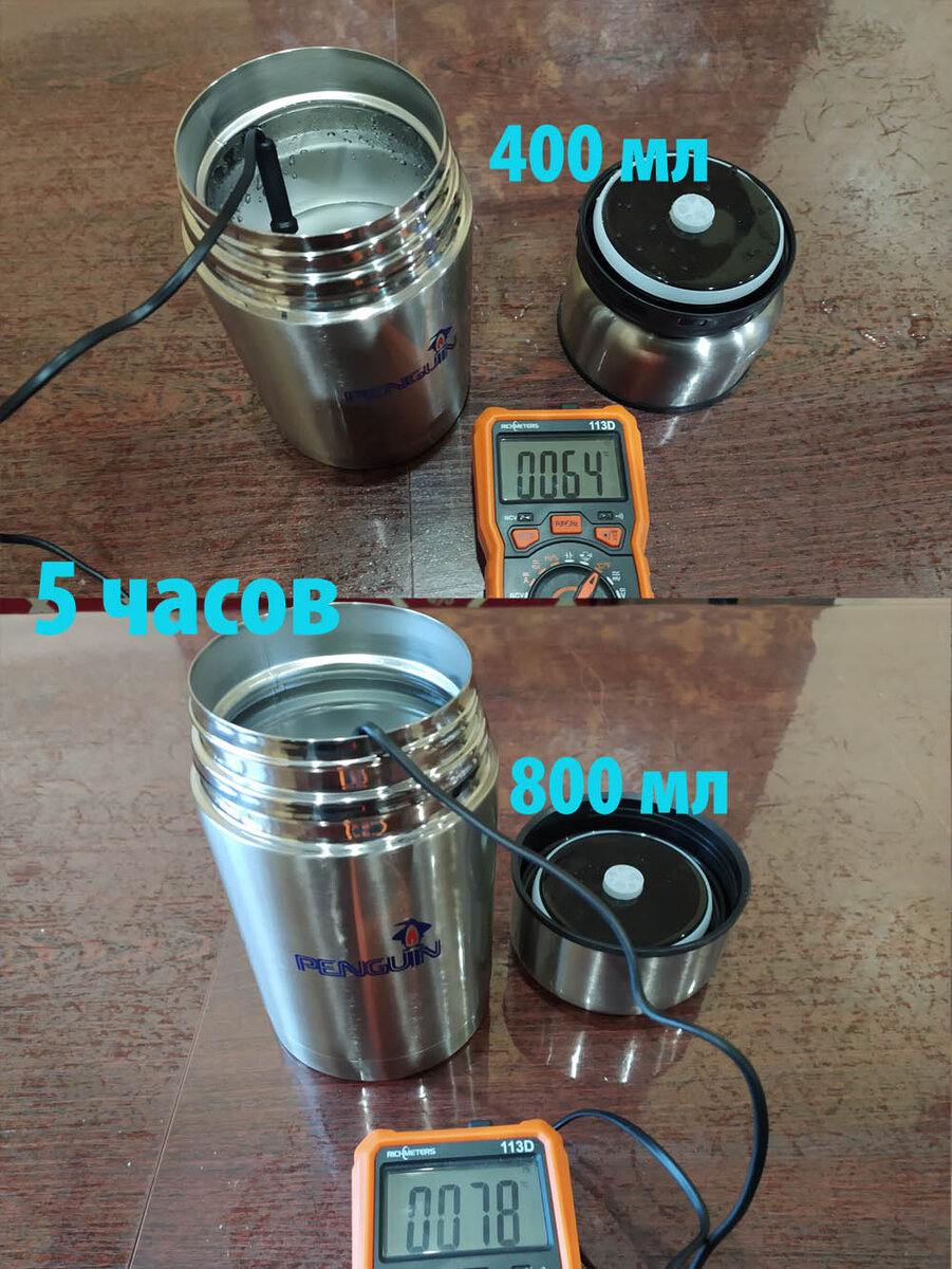 Что же у нас получилось. Если кипятка полный термос, а именно 0.8 литра то через 5 часов вода имеет температуру 78 градусов по цельсию. Это очень горячо. Если кипятка мы заливаем половину, ведь мало кто сможет осилить почти литр супа, и мы должны учитывать это. То через 5 часов температура уже 64 градуса. Это тоже довольно горячо. Оптимальная температура еды для человека это 40-45 градусов. Из этого и будем исходить.