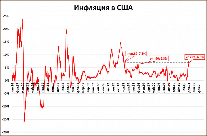 По итогам ноября инфляция в США выросла до 6,8%.
