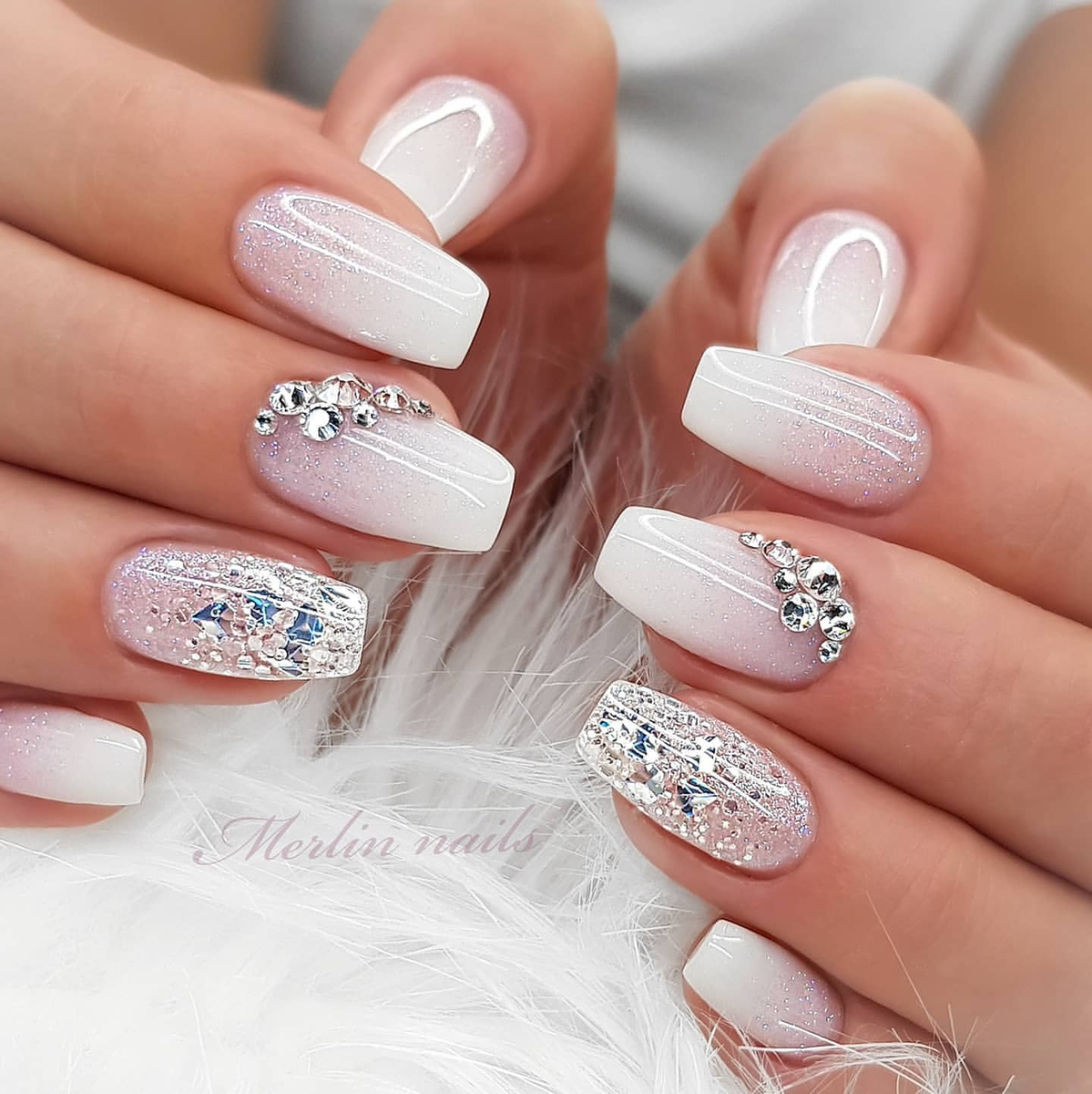 Градиентный маникюр прекрасен всегда и в любом исполнении, славится он своей нежностью, а в дизайне с использованием растяжки цвета от бежевого к белому выглядит предельно нарядно и торжественно. Усилить полученный эффект в свадебном градиентом маникюре помогут камушки и стразы, идеально дополняющие такой вид дизайна ногтей для невесты.