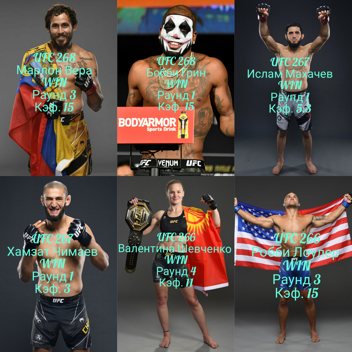 Статистика за три карда ставки делали по 1000 рублей в каждом раунде: -UFC 266 -Валентина Шевченко-Мёрфи Лоурен пяти раундовый бой был. Валентина Шевченко победа досрочно в 4 раунде кэф. 11*1000=11000-5000 которые ставили на 5 раундов. Итог чистой прибыли: +6000 руб. -Робби Лоулер-Ник Диас пяти раундовый бой был. Робби Лоулер победа досрочно в 3 раунде кэф. 15*1000=15000-5000 которые ставили на 5 раундов. Итог чистой прибыли: +10000 руб. -UFC 267 -Ли Цзинлян-Хамзат Чимаев трех раундовый бой был. Хамзат Чимаев победа досрочно в 1 раунде кэф. 3*1000=3000-3000 которые ставили на 3 раунда. Итог: 0 руб. -Ислам Махачев-Дэниел Хукер трех раундовый бой был. Ислам Махачев победа досрочно в 1 раунде кэф. 5.3*1000=5300-3000 которые ставили на 3 раунда. Итог чистой прибыли: +2300 руб. -Петр Ян-Кори Сэндхаген пяти раундовый бой был. Петр Ян выиграл решением судей, досрочные ставки не прошли. Итог: -5000 руб. -Ян Блахович-Гловер Тейшейра пяти раундовый бой был. Ян