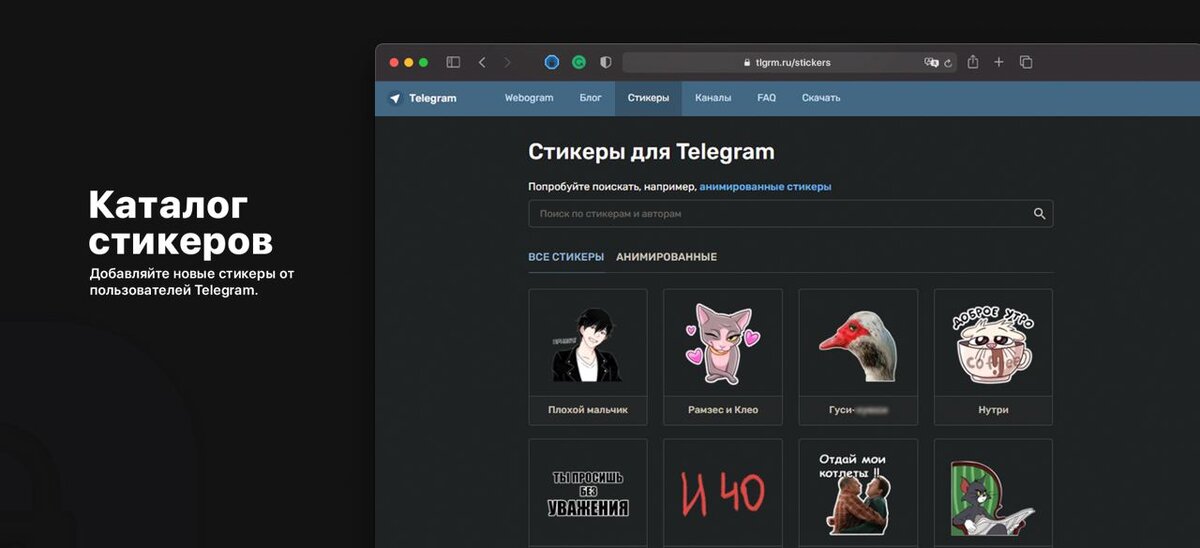 Несмотря на то, что каждому пользователю предоставляется возможность создать собственный стикерпак, поделиться им с большим количеством людей не получится, так как существует только небольшой каталог анимированных стикеров, которые были нарисованы исключительно дизайнерами. Чтобы добавить статичные или анимированные стикеры от пользователей Telegram, можно воспользоваться каталогом tlgrm.ru/stickers, который ежедневно обновляется и имеет удобную поисковую систему по ключевым словам. Помимо нахождения стикеров, любой посетитель так же может добавить свой набор в список, оставив ссылку в комментариях на главной странице. Что даст не только прирост установок, но и возможность отслеживать их количество, а так же взаимодействовать с обратной связью. больше статей в телеграмме