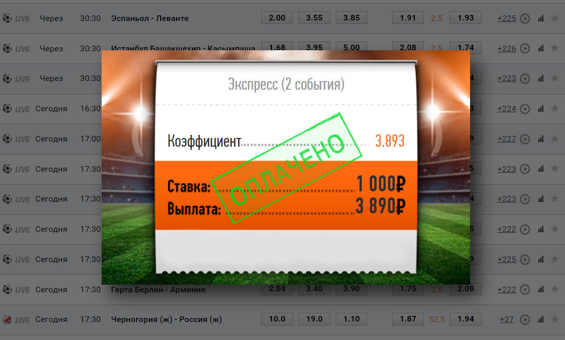 Игрок сделал ставку в размере 1000 рублей на победу футбольной команды. Коэффициент на событие был 1.7 и выигрыш составил 1700 рублей.