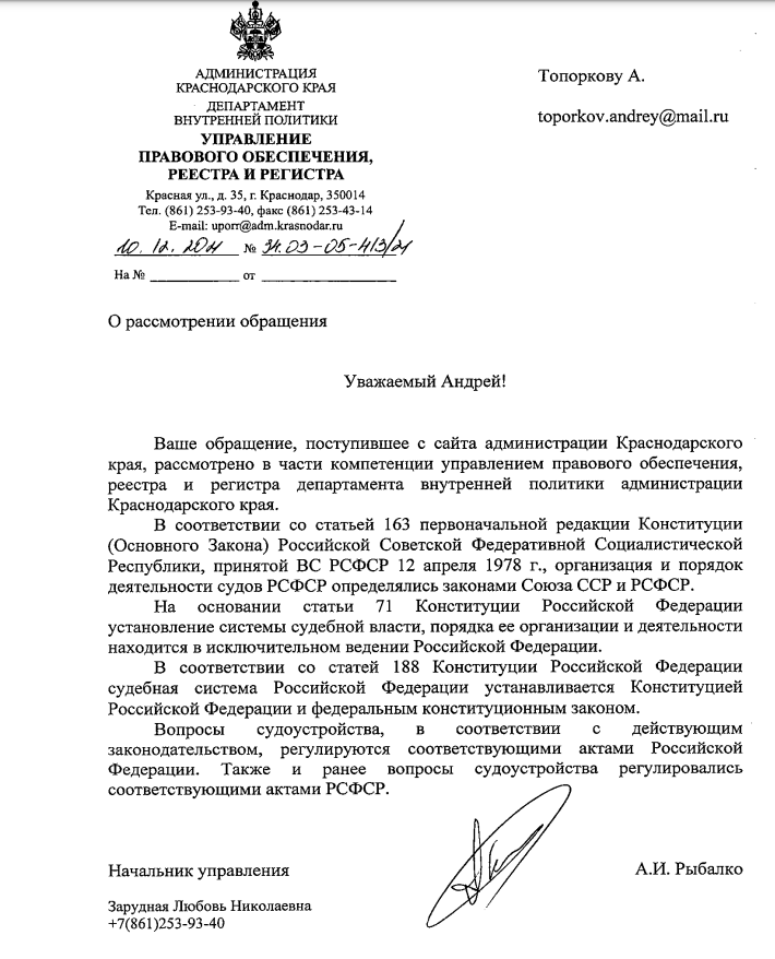Когда народ передал судебную власть? Ознакомившись с Уставом Краснодарского края, выяснил для себя интересные юридические нюансы,. Во первых ст. 15 Источник государственной власти народ, кому не понятно какой, смотрите ст. 2. Государственная власть делится на три независимые ветви, исполнительная, законодательная и судебная. Насколько мне известно для населения Краснодарского края организовывали выборы исполнительной и законодательной ветви, а вот с судебной ветвью вопрос. Соответственно направил запрос в Администрацию Краснодарского края чтобы они предоставили полный комплект документов начиная от постановления о назначении голосования до результатов голосования о наделении полномочиями от народа судебную ветвь. Вот что мне ответили. Вопрос остался открытым.