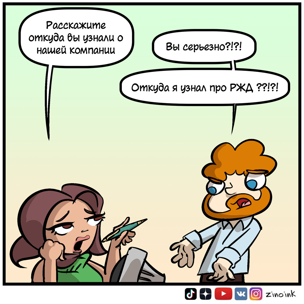 Привет, дорогой друг! Зимой сложно выбраться из-под одеяла и заставить себя отправиться по делам. Причем дело не только в позднем рассвете солнца, но и в крепком морозе за окном во многих городах России. Наверное, поэтому воскресные пробуждения так особенно приятны. Раз уж этим утром выходного дня не нужно никуда торопиться, я думаю, ты не откажешься прочесть новую статью, в которой я собрал #комиксы и #юмор . Рассчитываю, что эта крутая смесь прибавит тебе хорошего настроения. Кстати, сегодняшняя подборка будет чуть отличаться от обычных, потому что я собрал в ней только свои комиксы. Есть вещи, о которых в нашей стране знает каждый россиянин. Например, в нашей стране невозможно встретить человека, который никогда не слышал аббревиатуру РЖД. Ведь некоторые еще в младенчестве путешествовали в поездах. Однако, это не значит, что при приеме на работу в эту компанию, у тебя не спросят стандартные вопросы. Поскольку дети невероятно эмоциональны, то им бывает очень сложно говорить «нет». Но