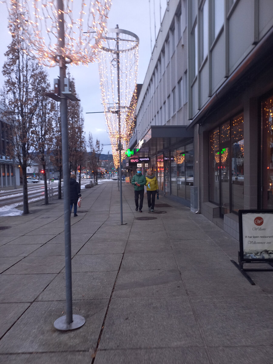 Туристов сейчас в Бергене не очень много в связи с известными событиями. Хотя улицы города выглядят мило и очаровательно в свете жёлтых сверкающих огней повсюду. Улицы малолюдны как- то даже не по-городскому. В трамвае тоже не много пассажиров. Ехать приятно. Передвигается он без тряски, рывков и пробок, строго по расписанию Площадь перед рождественским базаром. Так сейчас выглядит Рыбный рынок Очень интересные собеседники. Грязи нет. Можно и на асфальте посидеть. Вязальщица торгует своими изделиями прямо на улице. Снега на городских улицах почти не видно. Интересно отражение праздничной иллюминации в мокром асфальте. Кругом-кафе Мы сюда приехали принять участие в митинге и встретиться с друзьями. Ну и погулять по улицам. Видеокамеры фиксируют въезжающие в город автомобили и автоматически высылают счета за въезд в город. Так выглядит главная городская елка. Улица Брюгген. Музыкант на площади исполняет полонез Огинского. Приятно гулять по залитым веч