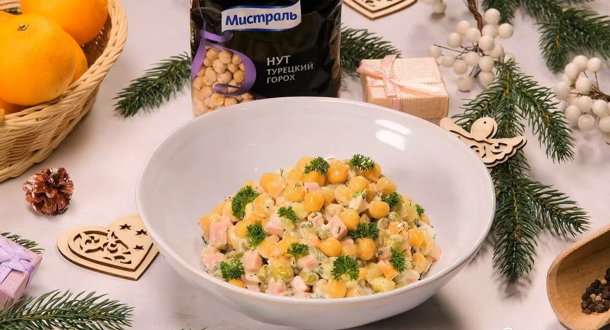 Трудно представить хоть один новогодний стол без оливье. Морковь, картофель, колбаса, зеленый горошек…. А если заменить последний чем-то более интересным — например, полезным нутом?