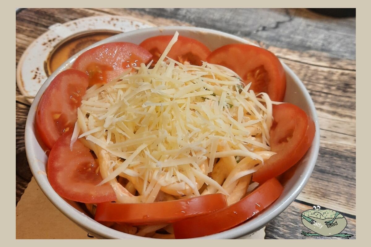 Помидоры сейчас уже невкусные. Сыр, если только он один, на 4 порции - дорого и не особо сытно, макароны с кетчупом ну как-то совсем просто. А отваренные макароны, как раз, имелись, на ужин сварила с избытком.