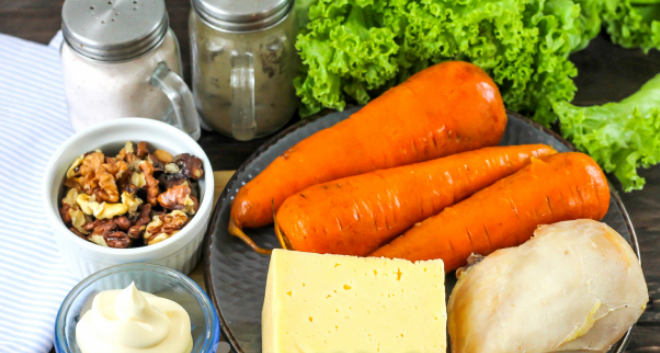 Ингредиенты Морковь отварная - 3 шт. Филе куриное отварное - 1 шт. Сыр твердый - 60 г Ядра грецких орехов - 60 г Майонез - 3 ст.л. Соль - 4 щепотки Перец черный молотый - 2 щепотки Гвоздика - 4-6 шт. (сушеная) *** Возьмите необходимые ингредиенты для приготовления салата в виде мандарина на Новый год (с курицей). Заранее отварите морковь и куриное филе, затем остудите их. Отварную морковь очистите от кожуры, промойте в воде и натрите на терке с мелкими ячейками. Не используйте терку с крупными ячейками, иначе салат будет смотреться не очень аппетитно! Выложите в морковь 1,5 ст.л. майонеза любой жирности, всыпьте 2 щепотки соли и перемешайте всю массу. По желанию в нее можно спрессовать очищенный зубчик чеснока, если вы любите блюда с чесночным ароматом. Отварное куриное филе нарежьте кубиками и добавьте в емкость блендера. Туда же всыпьте ядра грецких орехов. Измельчите всё в мелкую крошку (примерно 3 минуты). Выложите измельченную массу в глубокую емкость, добавьте туда же майонез, вс