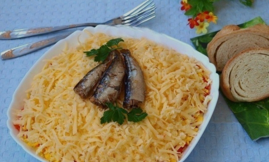 Ингредиенты ► шпроты - 1 банка; ► яйца варёные - 2 шт.; ► морковь - 1 шт.; ► картофель - 2 шт.; ► сыр твёрдый - 100 г; ► майонез - по вкусу. Приготовление 1. Картофель и морковь предварительно сварить, остудить и натереть на средней тёрке. 2. Шпроты переложить в отдельную посуду, слив масло, и размять вилкой. Три штуки оставить целыми для украшения. 3. В тарелку с бортиками выложить шпроты, сверху натёртый картофель. 4. Между ними наносить майонез не стоит, поскольку в шпротах достаточно масла, но если есть желание, то можно добавить. 5. Картофель смазать майонезом и выложить сверху натёртую морковь. 6. Яйца также натереть на тёрке. На смазанную майонезом морковь выложить яйца и нанести майонез. 7. Натереть твёрдый сыр и покрыть им весь салат. 8. Украсить верх салата "Океан" целыми рыбками и зеленью. Приятного аппетита🙂 Понравилось, тогда подписывайтесь на канал и ставьте 👍👍👍 Жду ваших комментариев. Спасибо. 😉