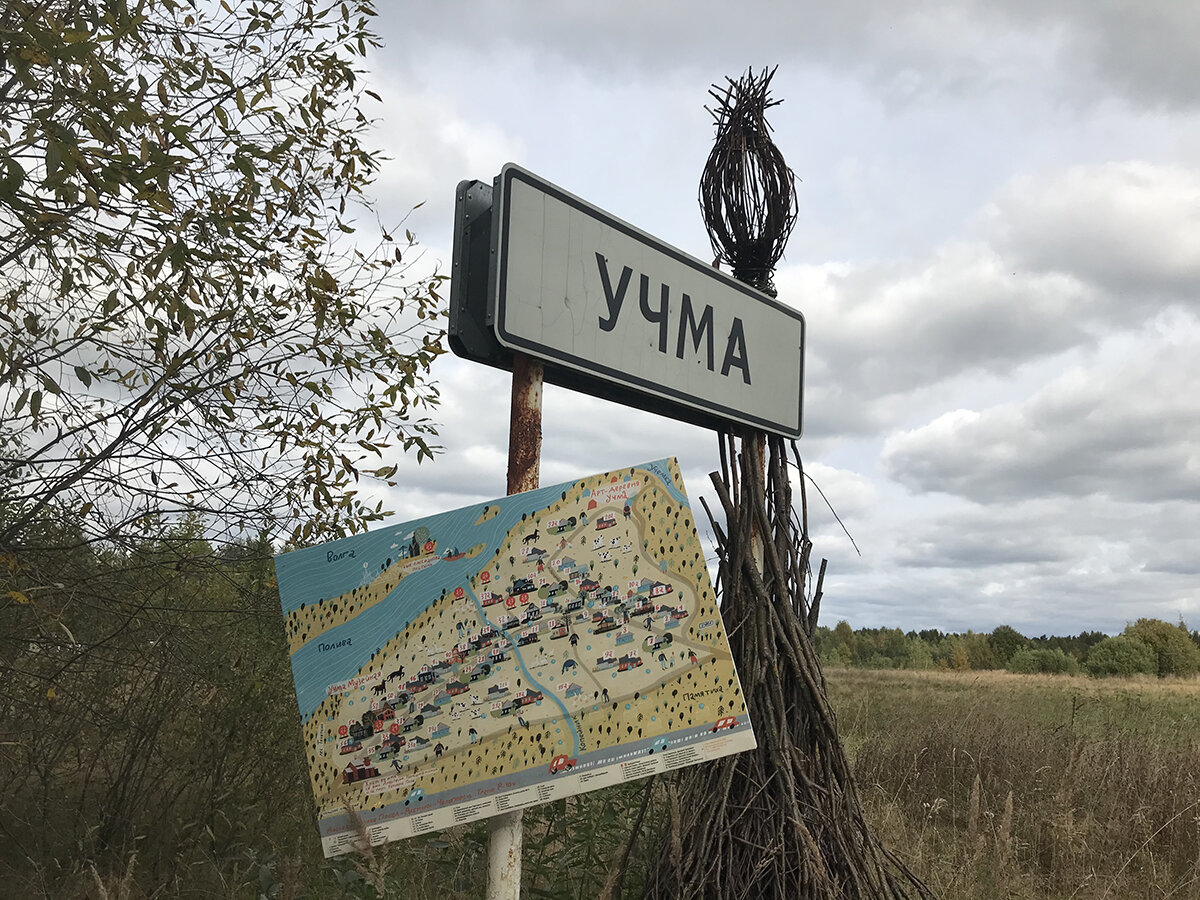 Осенью я путешествовал по Ярославской области. Основной целью являлся Углич, в котором я не был несколько лет. Хотелось освежить впечатления и посмотреть, изменилось ли что-нибудь в городе за последние годы. Особых изменений я не заметил и решил съездить на разведку в Рыбинск. Но дорога оказалась такой плохой, что я пожалел о своей затее почти сразу. Решил свернуть где-нибудь к Волге, погулять вдоль берега, перекусить на свежем воздухе и поехать назад. Так меня и занесло в село Учма. Учма относится к Мышкинскому району. Это совсем небольшое село на 30 человек, но оно сразу же меня заинтриговало. Возле таблички с топонимом населённого пункта стоял необычный плетёный объект, и была прикреплена карта, в которой Учма называлась Арт-деревней. Такое творческое самоназвание она начала оправдывать сразу же: на заборах я заметил рисунки, а на домах и сараях разные красивые резные элементы. История у Учмы интересная: с одной стороны трагичная, а с другой — полная надежд. Грандиозный проект 30—40