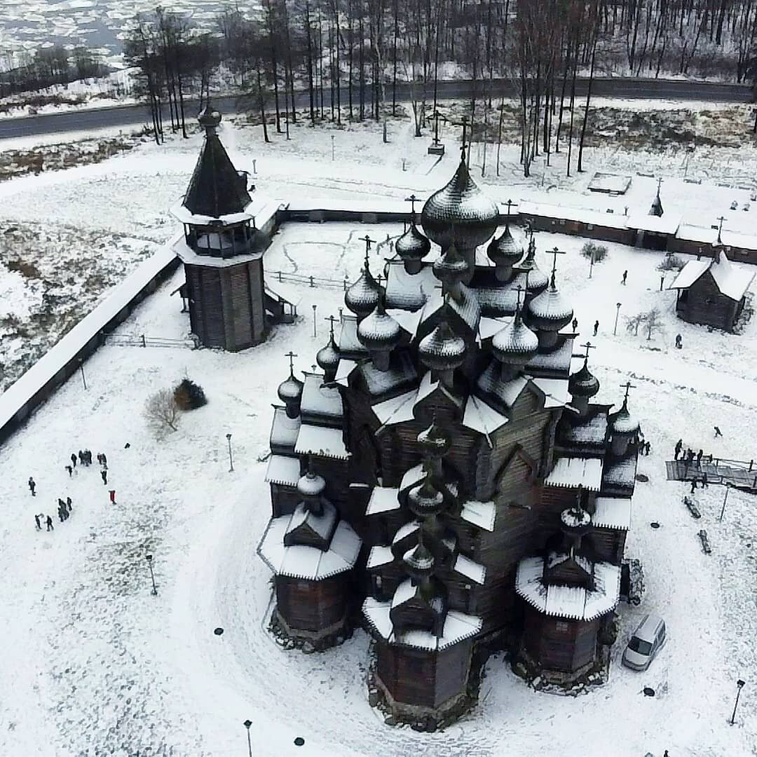 Покровская церковь с 25 главами - точная копия сгоревшей в 1963 году Покровской церкви (1708 года постройки) Вытегорского погоста в Вологодской области (остатки ее фундамента стали основой для Богословской).