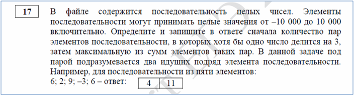 Демоверсия 2022 года. Демоверсия 2022 года. Вариант 2. Задачи с сайта Полякова К. #150 В файле 17-1.txt содержится последовательность целых чисел. Элементы последовательности могут принимать целые значения от -10 000 до 10 000 включительно. Определите и запишите в ответе сначала количество пар элементов последовательности, в которых хотя бы одно число делится на 7, а другое при этом не делится на 17. Затем - минимальную из сумм элементов таких пар. В данной задаче под парой подразумевается два идущих подряд элемента последовательности. Например, для последовательности -45; 14; 22; -21; 34 ответом будет пара чисел: 3 и -31. #151 В файле 17-1.txt содержится последовательность целых чисел. Элементы последовательности могут принимать целые значения от -10 000 до 10 000 включительно. Определите и запишите в ответе сначала количество пар элементов последовательности, в которых хотя бы одно число оканчивается на 6 и делится на 3. Затем - минимальное число в паре среди всех таких пар. В данной
