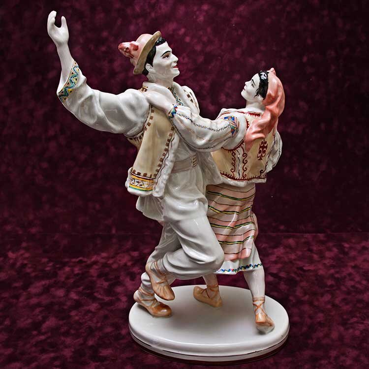 1. Большая коллекционная фигура «Гуцульский танец, Коломийка» (45*22*15 см). Производитель ГФЗ, 60-70-е годы 20 века, автор О.П. Рапай. Тонкая надглазурная полихромная роспись, золочение. Изображение танцующей пары в ярких закарпатских костюмах. Статуэтка с удивительно точной прорисовкой деталей (лица, национальный орнамент на одежде). В состоянии витринного хранения встречается крайне редко.