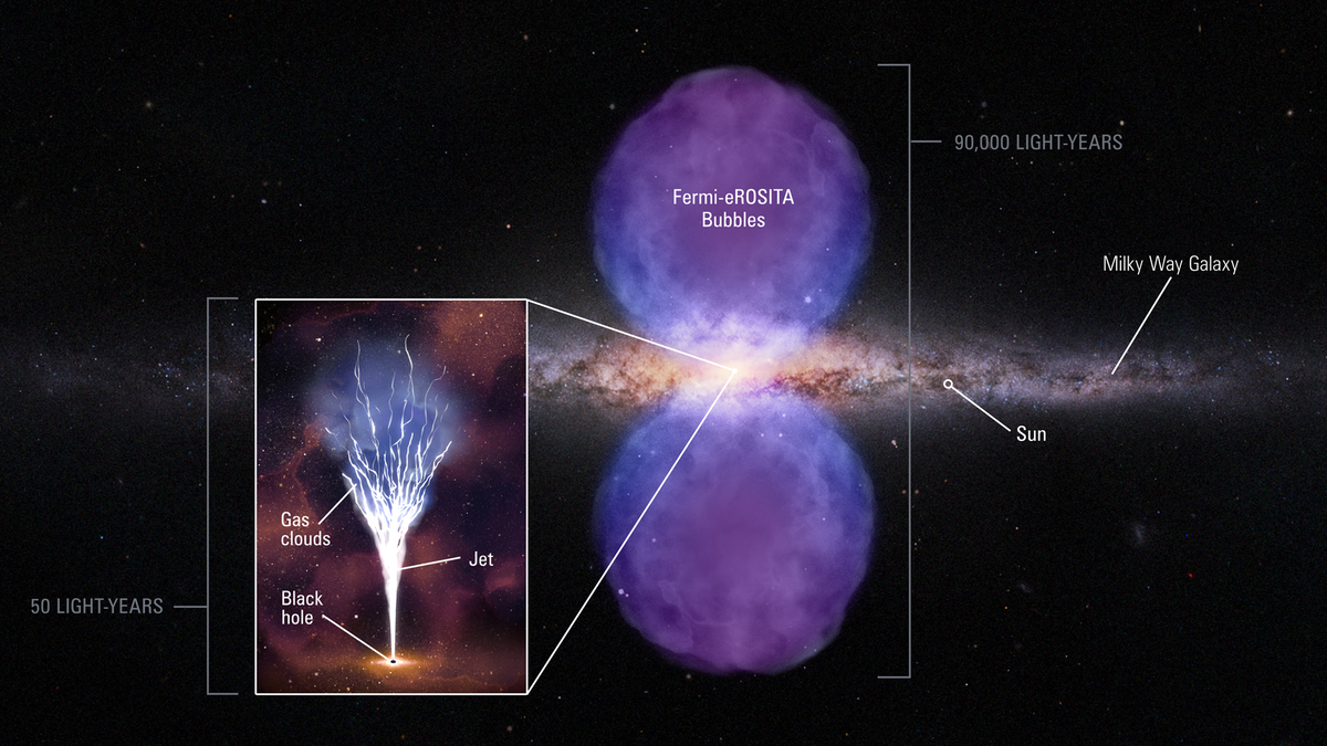 Сверхмассивная черная дыра в центре Млечного пути, имеющая массу в 4 миллиона солнечных, сейчас кажется достаточно спокойной. Однако изучение ее окрестностей показывает, что черная дыра Sagittarius A* периодически проявляет активность. Часть материала, который притягивается к ней, не достигает горизонта событий, а выбрасывается в виде джетов.