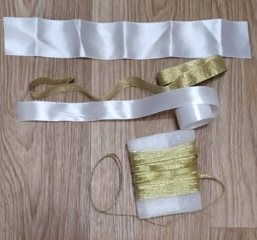 Многие девочки мечтают быть принцессами, и даже наряжаются, как принцессы в праздники. Особенно это часто случается в Новогодние праздники. Мамы наряжают своих дочек в роскошные платья. А для косичек маленьким принцессам я предлагаю сделать роскошные бантики. Сочетание белого и золотого достойно «настоящих принцесс». 1. Для бантиков «Настоящая принцесса» я выбрала такие ленты. 2. Нарезаю атласную ленту шириной 5 см на отрезки по 11см. для одного бантика мне потребуется 5 таких кусочков. Следовательно, для 2 бантиков – 10 штук. 3. Складываю ленту, как на фото так, чтобы получился прямой угол. 4. Складываю пополам, чтобы получилось так, как на фото. 5. Таким образом, складываю все 5 ленточек. 6. Прошиваю по краю швом «вперед иголку. Делаю 5 одинаковых стежков. 7. Не отрезая нитки, прошиваю все 5 заготовок. 8. Стягиваю нитку. Замыкаю кольцо. Получается красивый пятилепестковый цветочек. 9. Для двух бантиков я сделала два таких цветочка. 10. Из парчовой ленты золотого цвета нарезала кусочк