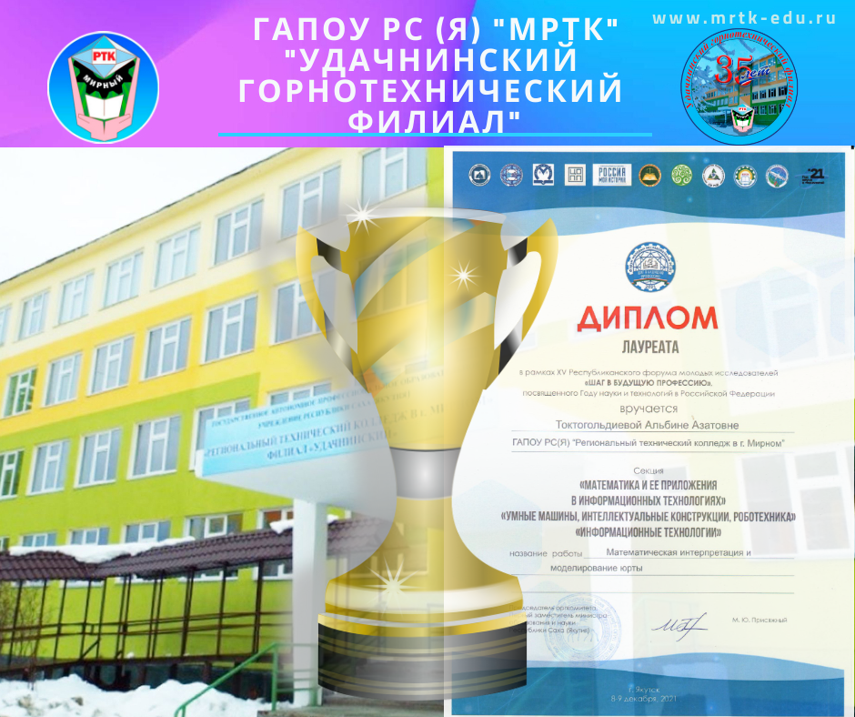 9 декабря 2021 года в историческом парке «Россия – моя история» состоялась торжественная церемония закрытия юбилейного XV Республиканского форума молодых исследователей «Шаг в будущую профессию», посвященного Году науки и технологий в Российской Федерации. Организаторами выступили Министерство образования и науки РС(Я) и ГАУ ДПО РС(Я) «Институт развития профессионального образования». Отрадно то, что на церемонии награды получили студентки «Удачнинского горнотехнического филиала» ГАПОУ РС(Я) «МРТК». Конкурсный отбор прошли более двухсот молодых исследователей из различных уголков республики, что говорит о масштабности данного мероприятия, и победить в нем было непросто. Под руководством преподавателя математики Чечек Кыдрашевой студенка второго курса Альбина Токтогельдиева, обучающаяся по профессии «Обогатитель полезных ископаемых», стала Лауреатом в Симпозиуме №3. Математика и информационные технологии в секции 3.1 Математика и ее приложения в информационных технологиях. Умные машины,