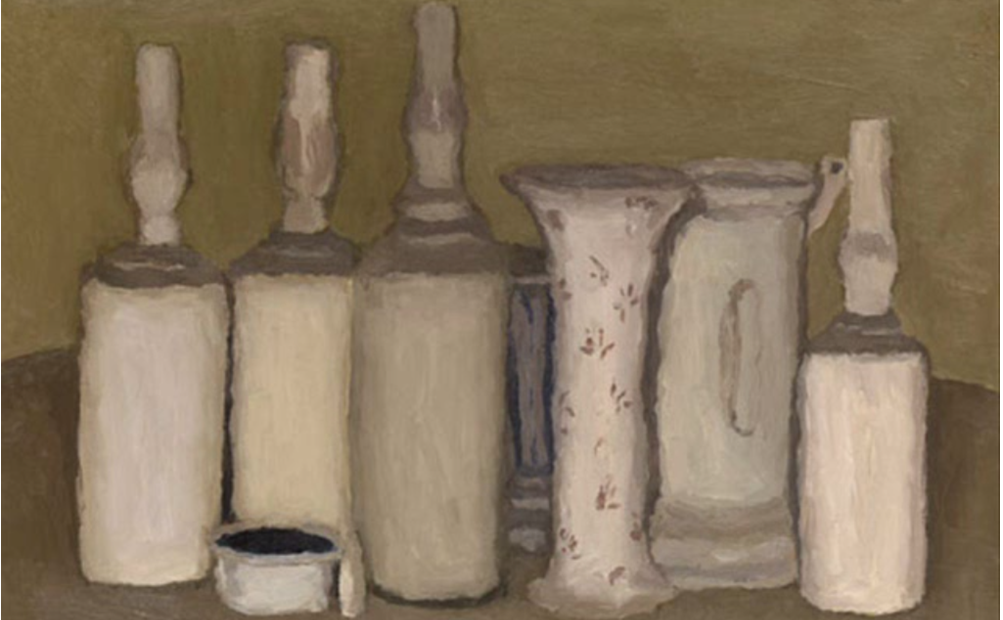 Моранди так композиционно подбирал предметы, задавал тоновые решения, определял контурные и силуэтные доминанты, что кажется, будто созданные им образы стоят на грани неустойчивости и закрепощенности, фактурной осязаемости и закостенелости, бездумья и раздумья, некого безвременья, присущего эпохе безыдейного оскудения. Просто удивительно, как же это своевременно для переломного состояния современной России.