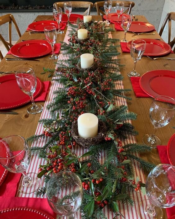 До Нового года осталось чуть больше 2 недель. Ленты наполняются новогодними статьями. Я пока не планировала ни меню, ни оформление новогодней ночи, но уже изучала варианты и вдохновлялась. Для меня одним из главных критериев является время. Хочу, чтобы сервировка стола отнимала минимум времени, но в то же время, чтобы посмотрев на нее было сразу понятно, какому празднику она посвящена. Кстати, именно это тема вдохновила меня на съемку нескольких мастер-классов, на которых я создавала аксессуары для новогодней сервировки. На этой неделе они появятся на нашем канале. А сейчас я покажу 5 идей, которые сохранила для себя, новогоднего убранства стола. Как только я начала смотреть опыт западных коллег, я увидела один общий элемент, который скорее всего не приживется у нас. Это композиция в центре стола. Чаще всего она выглядит примерно так: тканевая дорожка (раннер), на которой располагаются еловые ветки, свечи, елочные шары. С учетом обычного размаха празднования нового года на таком ст