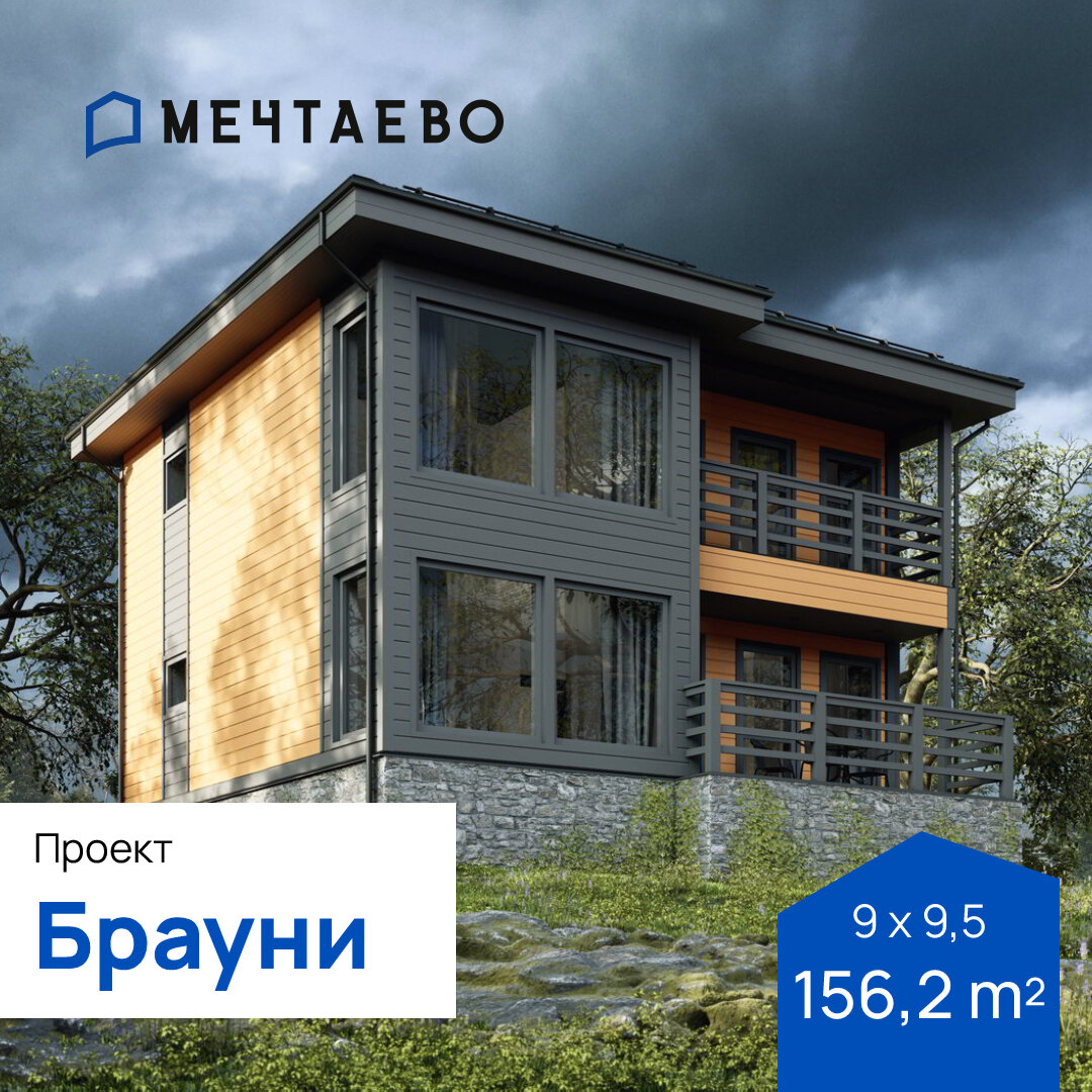 Самый вкусный, насыщенный и немного загадочный десерт? Конечно же, брауни! Не зря этот прекрасный дом назван в честь этой шоколадной сладости. Дом "Брауни" — прославление простоты и элегантности геометрии в союзе с удобством и функциональностью. Проект дома с 4-х сторон Дом выглядит очень современно и довольно сдержанно, даже немного строго. Натуральное дерево в сочетании с каменным цоколем, серой окраской балконов и части дома с панорамными окнами создают уникальную гармонию. Вы только представьте, как уютно можно устроиться на подушках около этих больших окон в пол — и даже в самую пасмурную погоду вы будете чувствовать себя защищённо! Планировка На первом этаже располагается крыльцо, тамбур, терраса, холл, спальная комната, гостиная, кухня и столовая. На втором этаже — три спальни, гардеробная и просторный холл. Есть два санузла на каждый этаж: на первом — с ванной, на втором — с душевой. Больше информации о проекте и подробная смета на нашем сайте → Каталог каркасных домов →→→ Про