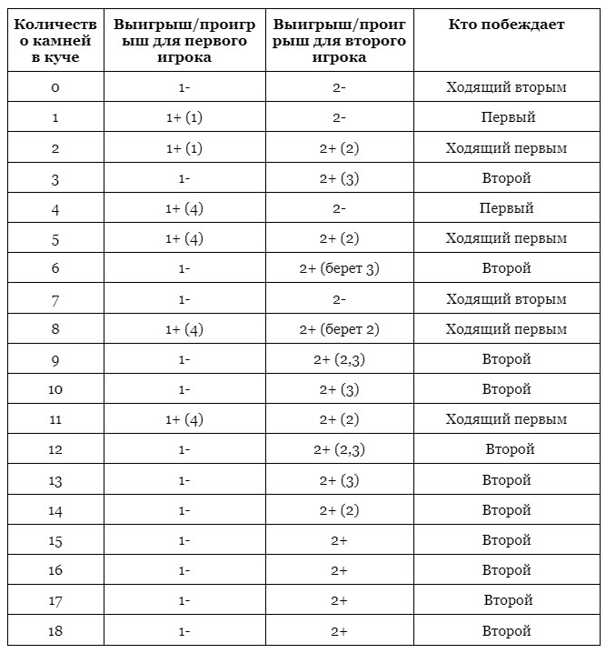 Ниже приведена таблица решения. В скобках написано количество камней, которое берет игрок, чтобы выиграть. Плюс/минус означают выиграет игрок или проиграет. Если игрок может оставить врага в проигрыше своим ходом, то он побеждает. По такому принципу мы заполняли следующую таблицу. Здесь мы видим следующую закономерность: начиная с 12 выигрывает второй, так как у него больше нет проигрышных ситуаций. Модифицированная задача №1 Из кучи, содержащей Н камней, два игрока по очереди забирают порции, первый – 1 или 3 камня, второй – 2 или 4 камня. Проигрывает тот, кто не может сделать ход. Кто победит? Решение