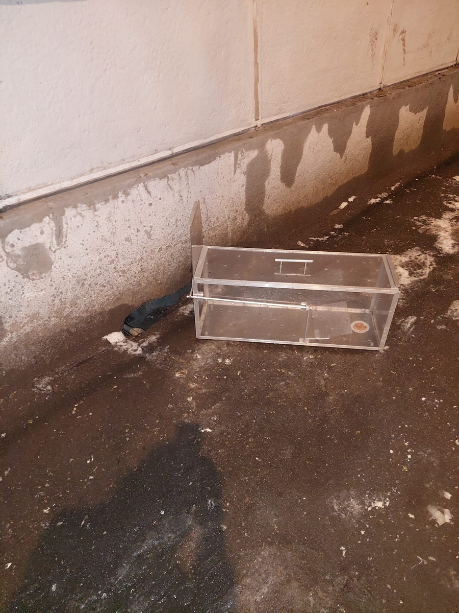 Первая попалась Чернуха, она несла крылышко голубя в щель соседнего дома, отключенного от коммуникаций и давно выселенного, но унюхала вкусный запах из котоловки. И мы приняли тяжкое решение её выпустить, т. к. сами котят не видели, опирались на чужие сведения и боялись, что вдруг котята заболели или ещё чего, может они без Чернухи пропадут, если мы их не поймаем. Ведь она же крылышко несла кому-то, котятам вероятно...