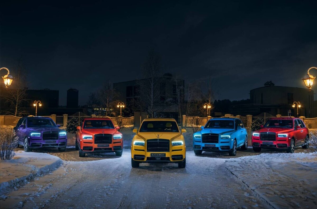 Британская марка люксовых авто представила коллекцию из пяти Cullinan специально для покупателей из России. Внедорожники стали частью эпатажной серии «Black & Bright», созданной с прицелом на менее консервативную аудиторию. Впервые яркие краски снаружи и внутри примерило на себя четырехместное купе Wraith в 2019 году. Все пять машин получили уникальную окраску кузова: голубой Turchese, ярко-оранжевый Orange metallic, фиолетовый Twilight Purple, насыщенный желтый Forge Yellow и бордо Magma Red. Как говорят в самом Rolls-Royce, дизайн «цветных» Cullinan вдохновлен огнями ночной Москвы. Вставки передней панели сделаны из карбона, нити которого по-особому сплетены для создания эффекта объема. Каждый лист волокна сначала сушат 72 часа, затем покрывают шестью слоями лака и полируют до зеркального блеска. Создание одного такого элемента занимает 21 день. В числе других отличий «звездное небо» в тон кузова, и накладки с названием коллекции на порогах. Под Духом Экстаза разместился