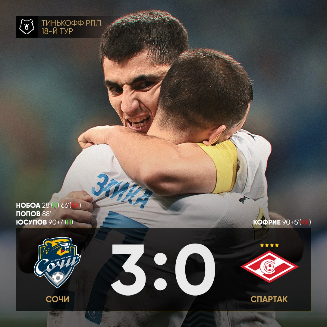 Ветеран "красно-белых" рассказал, что думает после игры на Фиште. Красиво закончить год "Спартаку" не удалось. Клуб был более чем близок к положительному исходу, но неожиданно схлопотал разгром. К сожалению, Витория усугубляет своё положение перед зимним отпуском. Эта игра олицетворяет всю работу Витории в клубе: потрясающая игра и невероятная неудача. Уж 3 гола "Сочи" не заслужил. Третий — какой-то психоз Кофрие, второй — единственная контратака в матче. Ну а что делать, когда у тебя со скамейки выходят Шитов и Мелкадзе, а 9 из 26 подач делает Ломовицкий. В такие моменты решает глубина состава, а Рую её просто не дали. Причём Ломик сыграл ещё более менее достойно (кстати, наверно тоже последний матч за КБ). Трудно кого-то винить. Бывает так — не везёт. Но нельзя утверждать, что "Спартак" был плох. Команда доминировала большую часть матча и это подтверждается статистикой. Иногда просто не везёт, и такие матчи не объясняются логикой. Хотя присутствие удачи/неудачи - фактор, который в