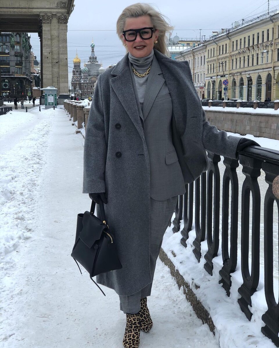 Монохромные образы актуальны особенно в холодный сезон. И это не мудрено. Создавая монохромный ансамбль гораздо сложнее ошибиться, ведь не обязательно подбирать вещи тон в тон, не менее интересно смотрится одежда в разных тональностях одного цвета. Ниже 10 безупречных нарядов для женщин «за 50», которые можно носить всю зиму. Серый – это ахроматический цвет, базовый, но никак не скучный. Чтобы быстро создать стильный зимний аутфит, понадобится водолазка, серый брючный костюм и двубортное пальто аналогичного цвета. Ботильоны с узнаваемым леопардовым принтом сделают образ динамичнее. Главное отличие монохрома от тотал-лука заключается в том, что в первом случае образ состоит из вещей одного цвета, но разных тонов. Так, нейтральный беж и его многочисленные оттенки превосходно ладят между собой. Образ в пудровой гамме, состоящий из кашемирового пальто, трикотажного платья и дополненный сапогами с тиснением под крокодила, выглядит очень стильно и эффектно, несмотря на свою простоту. Комплек